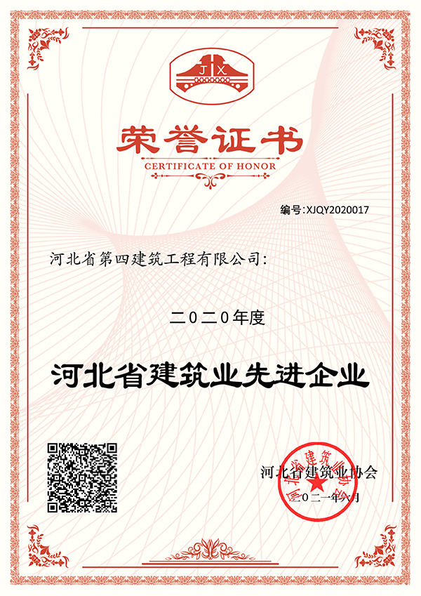 近日,经河北省建筑业协会审定并网上公布,公司再次喜获“2020年度河北省建筑业先进企业”荣誉称号,公司已多年蝉联此项荣誉。