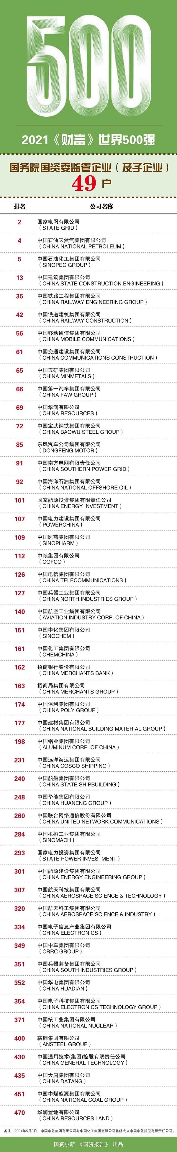 2021年度国务院国资委监管的49家入围世界500强的中央企业(及子企业)完整名单